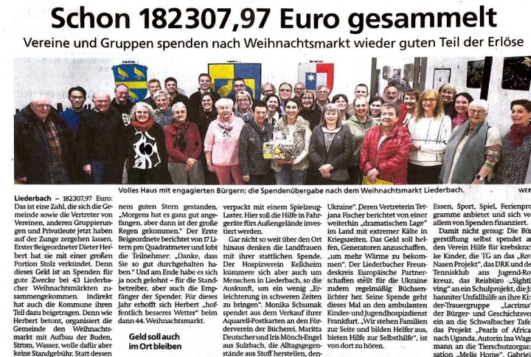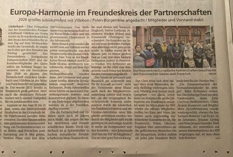 Der Freundeskreis Europäische Partnerschaften Liederbach e. V. (FEP) freut sich über die häufigen Presseauftritte. Die Berichte über die vielfältigen Aktivitäten des Vereins sind nicht nur informativ, sondern auch inspirierend. Häufig werden die engagierten Menschen hervorgehoben, die sich unermüdlich für den Austausch und die Förderung europäischer Partnerschaften einsetzen. Die Aktionen des FEP reichen von kulturellen Veranstaltungen bis hin zu sozialen Projekten, die das Miteinander und die Verständigung über Grenzen hinweg fördern.